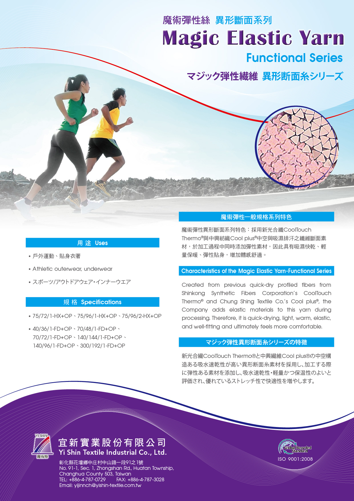 Benefited from its irregular cross section, this yarn is with advanced performance in moisture management. It is quick-drying, light weight, warm, elastic and well-fitting which gives ultimate comfort to users.